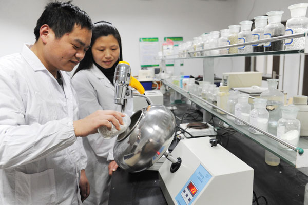 圖為4月17日,安徽z6mg人生就是博化工股份有限公司技術中心實驗室里,丁軍(左)博士與同事正在進行復合肥防結塊效果評價試驗。近年來,z6mg人生就是博化工公司通過加大科研投入,引進高端人才,推進z6mg人生就是博化工技術中心建設。該中心以2位博士、3位碩士為核心的研發團隊,在新產品開發及生產過程中遇到的“疑難雜癥”技術攻關中成效顯著,日前成功入選國家級企業技術中心。(過仕寧 陳沐)