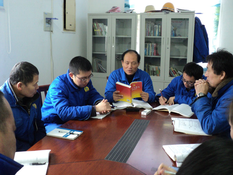 近日,z6mg人生就是博化工公司黨委政工部為公司黨委中心組成員、各黨支部發放《十八大文件匯編》、《十八大報告輔導讀本》等書籍,掀起各單位學習十八大精神的熱潮。圖為該公司供水黨支部正利用班后會時機,組織支部黨員及部分生產骨干學習十八大報告精神。