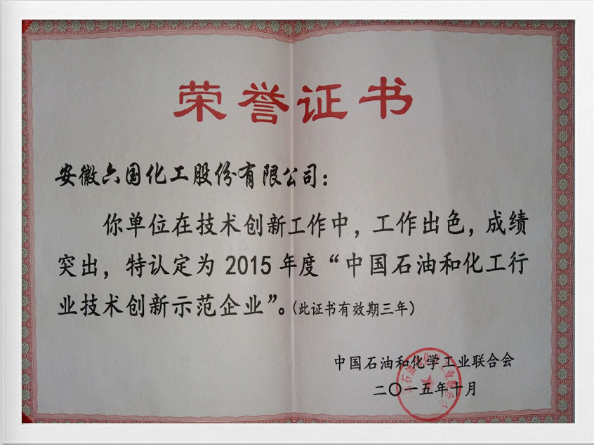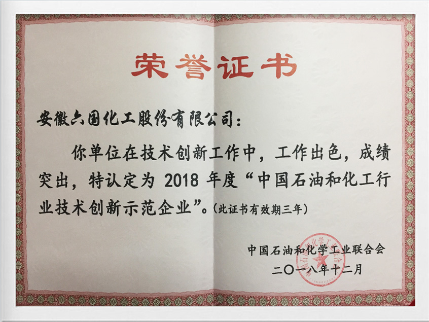 中國石化行業(yè)技術創(chuàng)新示范企業(yè)證書2018年